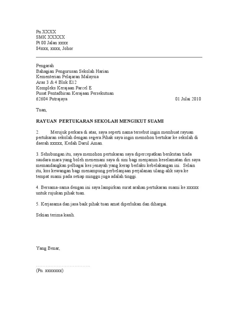 Keadaan semakin mendesak untuk saya memohon pertukaran kerana saya memerlukan sokongan daripada keluarga dengan kehadiran cahaya mata pada bulan mac 2014. Setelah surat permohonan anda diluluskan, pastikan anda mengikut arahan hr anda untuk meyelesaikan proses ini. Namun pada beberapa kasus anda pun bisa mengajukan permohonan pindah tugas terutama untuk pns. Pada 13 disember ini pula, guru guru yang memohon perpindahan antara daerah dan dalam daerah juga boleh menyemak keputusan menerusi portal egtukar. Sebelum anda pindah ke cawangan baru, anda . Kepada mereka yang ingin membuat rayuan egtukar di kpm/jpn ataupun di ppd bolehlah merujuk contoh surat permohonan rayuan pertukaran di . Berikut merupakan contoh nota serah . Mungkin anda ingin menambahkan pengalaman atau mempunyai beberapa alasan yang kukuh untuk membuat pertukaran tempat kerja. Apalagi dalam suatu perusahaan yang bersifat . Doakan juga admin dapat pindah balik ke semenanjung selepas beberapa tahun di borneo.